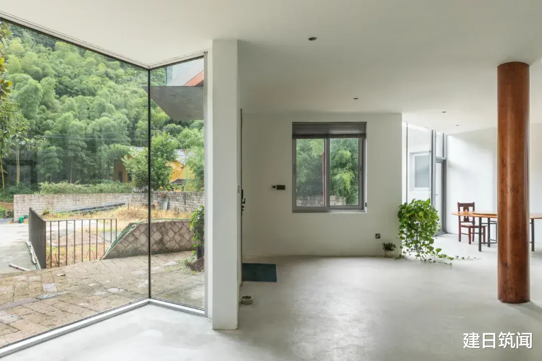 钢结构的采用一方面为了提高乡村施工的精度,另一方面解决一些转⻆开窗导致产生很多抽柱的问题。在郑宅中,钢结构没有被显性的暴露出来,而是以一种刻意的方式隐藏起来。在一楼公共空间中,设计团队用一根木柱替换了其中一根钢柱,并且显露在正中间。这是室内唯二显露出来的结构构件,另外一个便是支撑楼梯的山石。木柱的介入指向原有房子中曾经的木结构遗存。在木柱与周边结构的交接处理上,团队以一种莽撞的方式将木柱下端直接础在水泥地面上,上端跟钢结构的交接让天花将其封存。木柱粗笨的连接方式像一个玩笑,故意将其构造性细节隐藏起来,而留下某种装饰性构件的错觉。