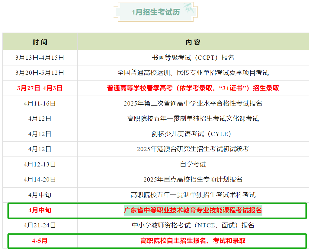 根据广东省教育考试院发布的4月招生考试历,有两项考试中职生要重点关注:高职自主招生考试报名和广东省中等职业技术教育专业技能课程考试报名