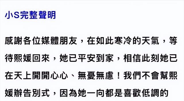 大S去世后,小S也用实际行动表示了对姐姐的爱,遵循了大S的遗愿,没有举行盛大的告别仪式。