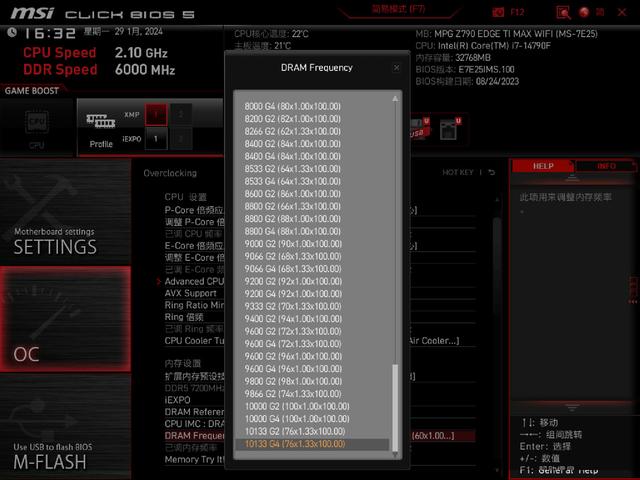 微星MPG Z790 EDGE Ti MAX WIFI主板的BIOS中内存OC参数多到头大,频率微调就能支持到10133MHz,而X.M.P 7200MHz轻轻松松就已经达成了!
