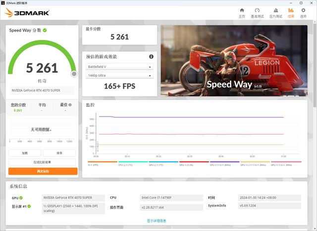XPG龙耀D500G DDR5-7200内存的支援下,有i7-14790F加持的RTX4070 Super GAMINGX SLIM MLG魔龙姬显卡的战斗力发挥基本达到100%了,Speed Way是DX12的最新环境测试,跑5261就已经达到传奇级别了;Port Royal是光追实测,跑了13610,同样达到传奇级别;Time Spy是DX11实测,跑了21107,传奇级别是不是告诉大家RTX4070 Super会是个传奇。