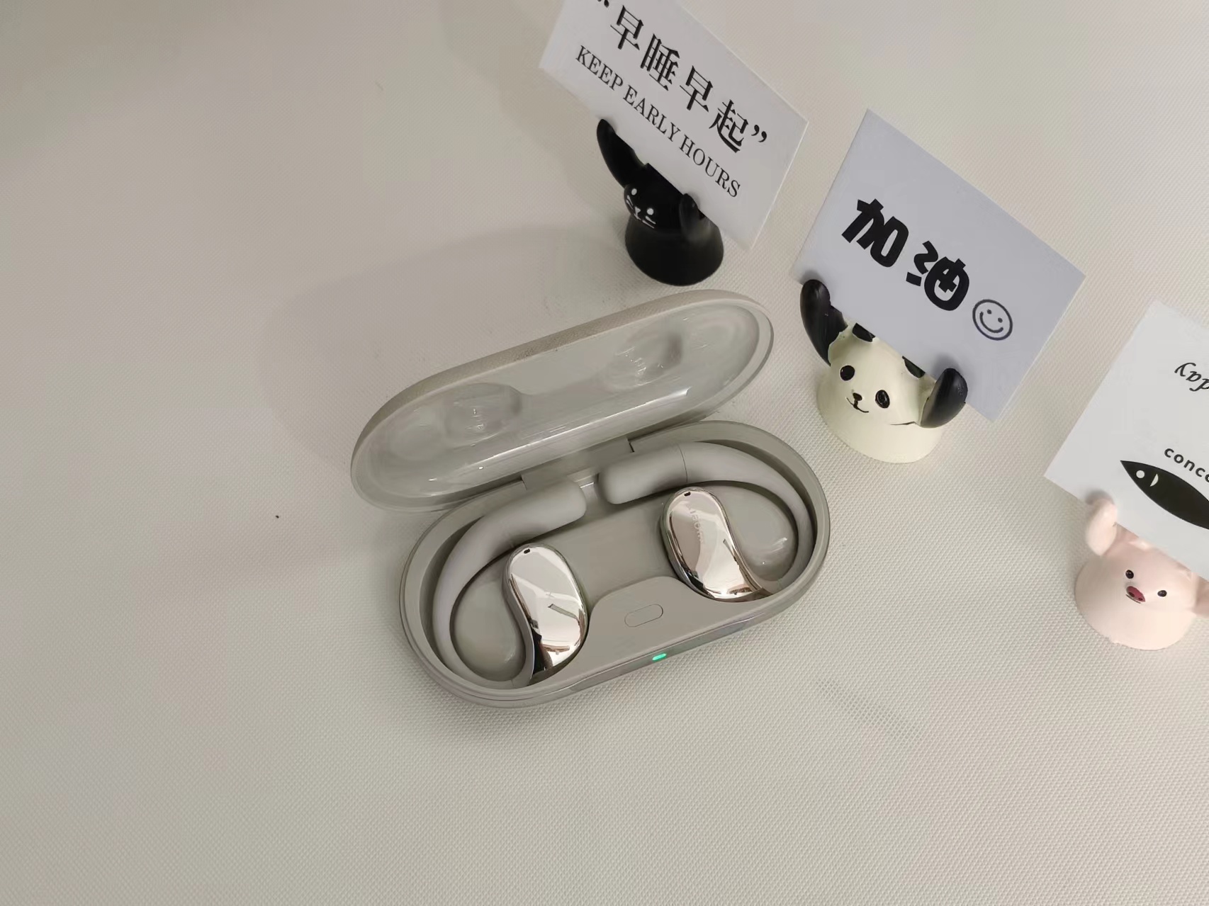 佩戴体验:耳机采用亲肤液态硅胶材质,触感柔软。4 档可调节耳挂,贴合不同耳型,稳固舒适。单耳 10g 重量经精心设计分散,即便长时间佩戴,耳部也轻松无压,无论是运动健身,还是日常通勤,都适配无忧 。