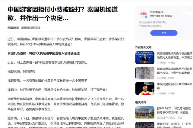 2.中国游客因拒付小费被殴打?泰国机场道歉,并作出一个决定…(中国青年报2018-09-30 15:12)