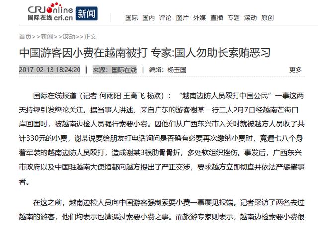 1.中国游客因小费在越南被打 专家:国人勿助长索贿恶习 (2017-02-13 18:24:20|来源:国际在线)