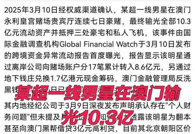 据悉,该明星因为赌博可谓是输光了全部家产,10亿多资产、三处豪宅、私人飞机......