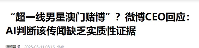 参考信源:潇湘晨报2025年3月1日——“超一线男星澳门赌博”?微博CEO回应:AI判断该传闻缺乏实质性证据