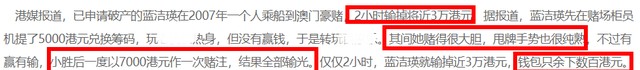 据悉,蓝洁瑛曾在两小时内输掉3万港币,不过还好身上留下了回家的路费钱,否则最后只能流浪街头了。