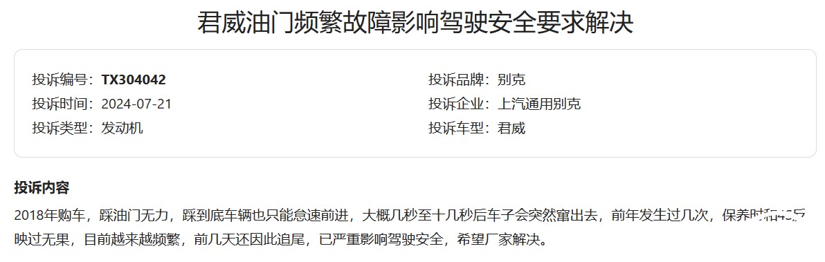 还有车主表示,自己2018年购买的君威目前出现了油门无力的情况,踩到底也只能怠速前进,在几秒和几十秒之间车子会突然窜出去。甚至,这种情况的发生还导致车辆在行使过程中发生追尾,已经严重影响到了驾驶安全。