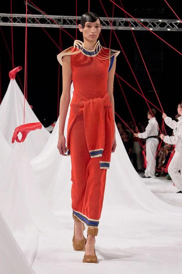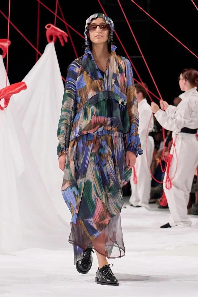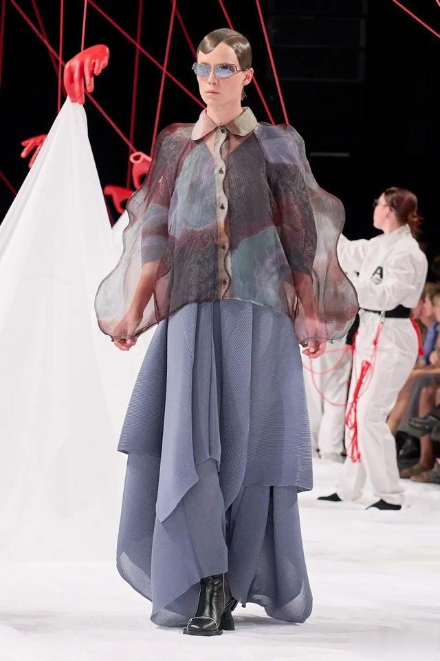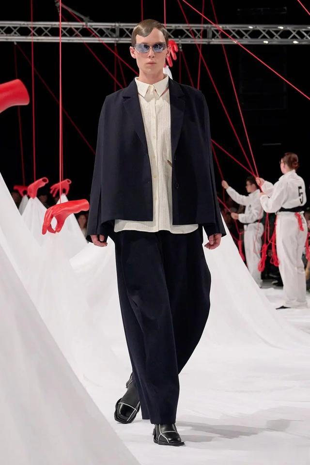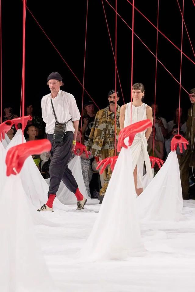 在这一幕中,手不仅是执行者的工具,而是艺术创作的关键元素,展现出独特的表现力。助手的每一次动作都构建了一幅充满不确定性的景观,令人沉醉于这柔和且迷人的视觉享受之中。流动性无疑是整个表演的核心,既体现在轻盈的布幔之中,也体现在服装的曲线设计上。然而,这一切的呈现并不完全和谐,或许这正是设计师Henrik Vibskov希望传达的讯息——对当今世界的迷茫和困惑,反映出对彼此扶持、携手共进的呼唤。