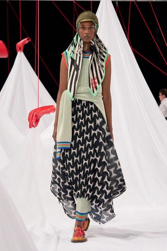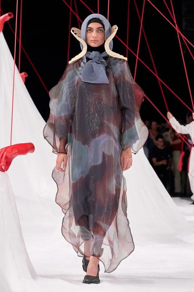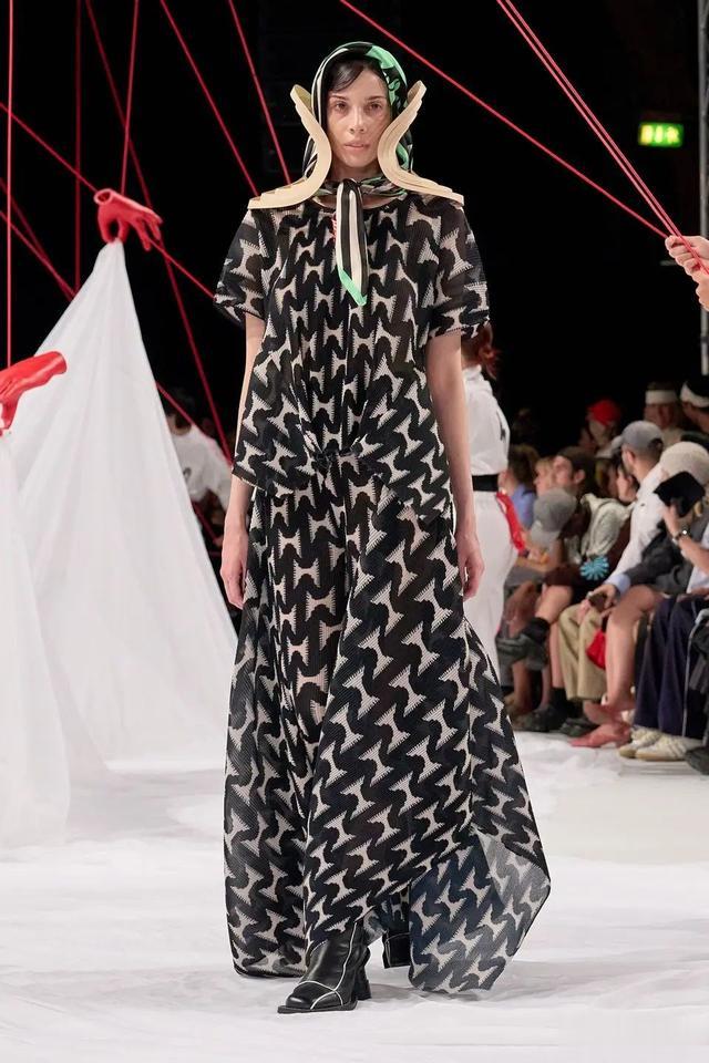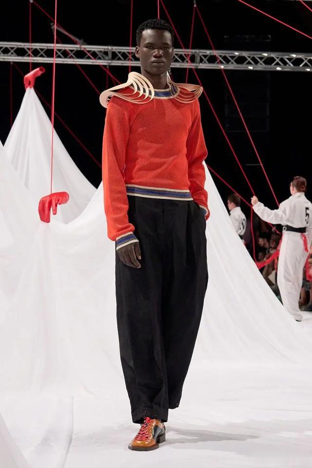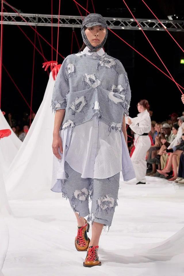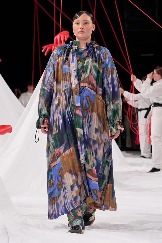 在这一幕中,手不仅是执行者的工具,而是艺术创作的关键元素,展现出独特的表现力。助手的每一次动作都构建了一幅充满不确定性的景观,令人沉醉于这柔和且迷人的视觉享受之中。流动性无疑是整个表演的核心,既体现在轻盈的布幔之中,也体现在服装的曲线设计上。然而,这一切的呈现并不完全和谐,或许这正是设计师Henrik Vibskov希望传达的讯息——对当今世界的迷茫和困惑,反映出对彼此扶持、携手共进的呼唤。