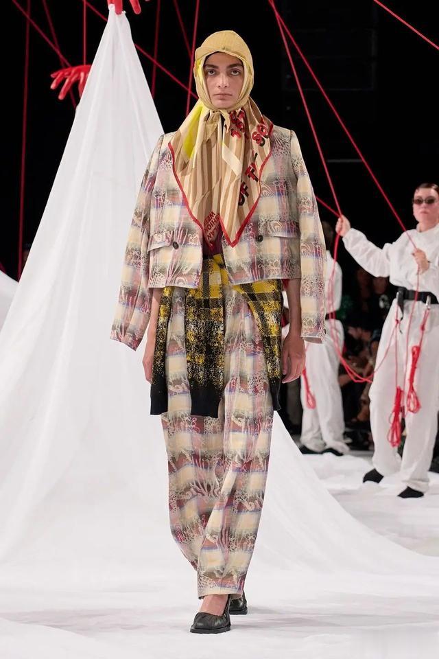 Vibskov在纺织品上的运用独具匠心,尤其是为2025春夏季系列所设计的作品,展现了极大的复杂性与大胆风格。例如,一款黑黄格子面料的作品,虽然与缩小版的紫罗兰色不甚相配,却因其独特的风格而吸引了众多目光。更令人瞩目的是,那种带有海洋生物图案(如章鱼)的奶油色格子面料,巧妙地与条纹毛衣搭配,创造出一种令人耳目一新的时尚魅力。
