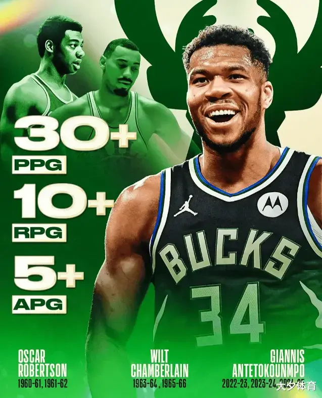 这项纪录一度也是尘封起来,一直到59年后的今天,字母哥累计3次轰下场均30+10+5的赛季,才正式超越了张伯伦。能够把得分、篮板和组织都做到了一流水准,字母哥绝对是现役前三的人物。