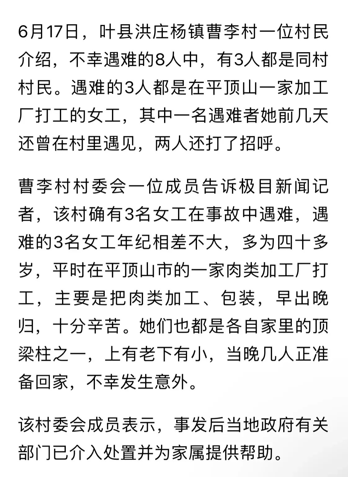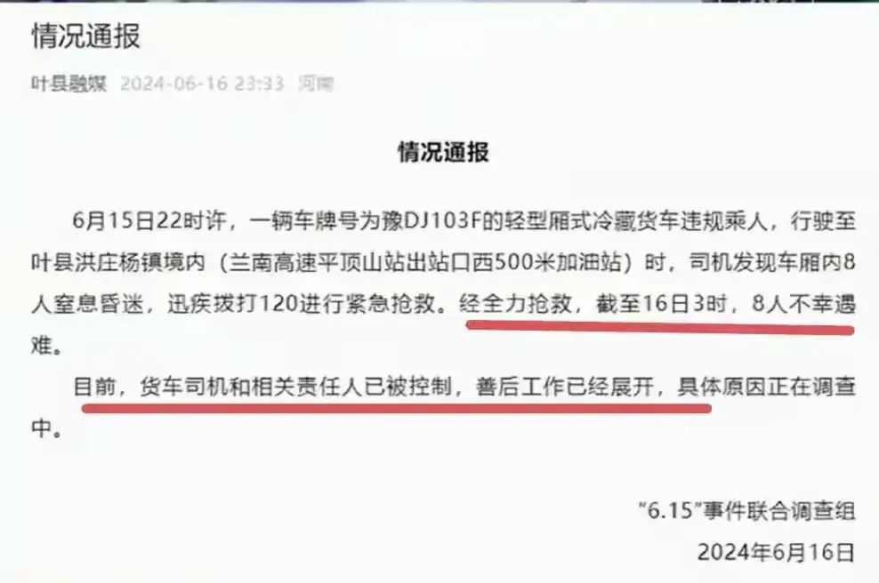 6月15日,河南叶县,这辆冷藏车像往常一样行驶在路上。不同的是,车厢内违规搭载了8名工人。这些工人都是附近村庄的女性,在一家牛肉加工厂工作。由于加班晚归,她们选择了这辆冷藏车作为回家的方式。然而,这一次,她们没能平安到家。