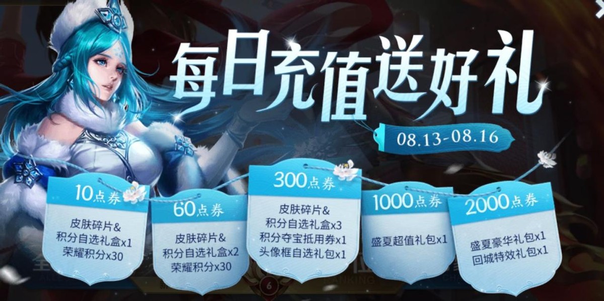 虽然王昭君这款皮肤颜值很高手感很棒,但是这里并不建议玩家在第一时间入手,因为在今天更新后官方还推出了一项每日充值送好礼的活动,也就是说,1300点券,可以分为四天充值,每次充值都可以获得相应的奖励和最大的折扣,这样再去入手,王昭君传说皮肤性价比更高。