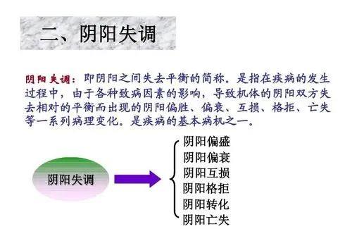 阴阳失衡又是脏腑、经络、气血、营卫等相互关系失调以及表里出入、上下升降等气机运动失常的概括。由于六淫、七情、饮食、劳倦等各种致病因素作用于人体,也必须通过机体内部的阴阳失衡,才会导致疾病的发生。因此,阴阳失衡又是疾病发生、发展变化的内在根据。