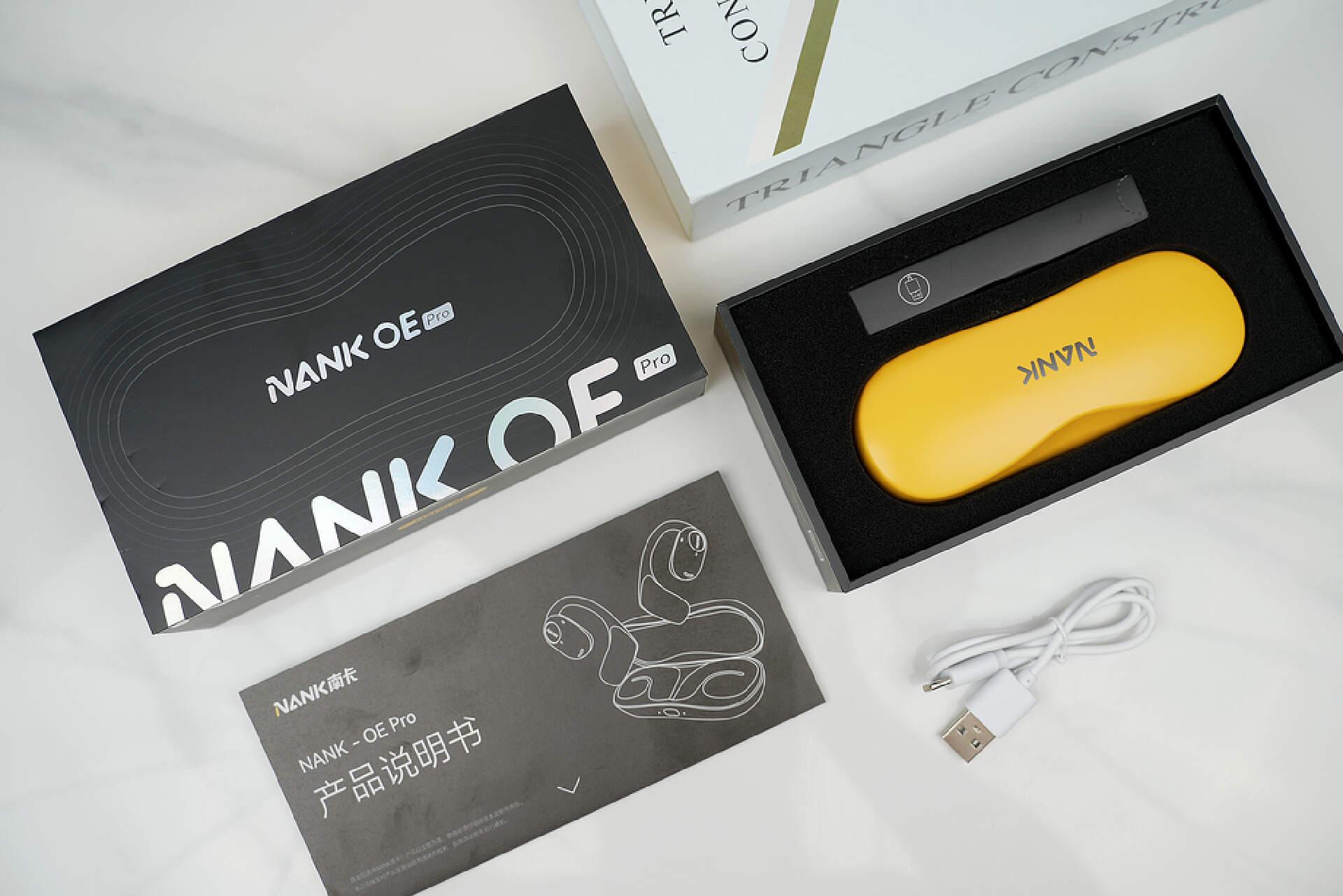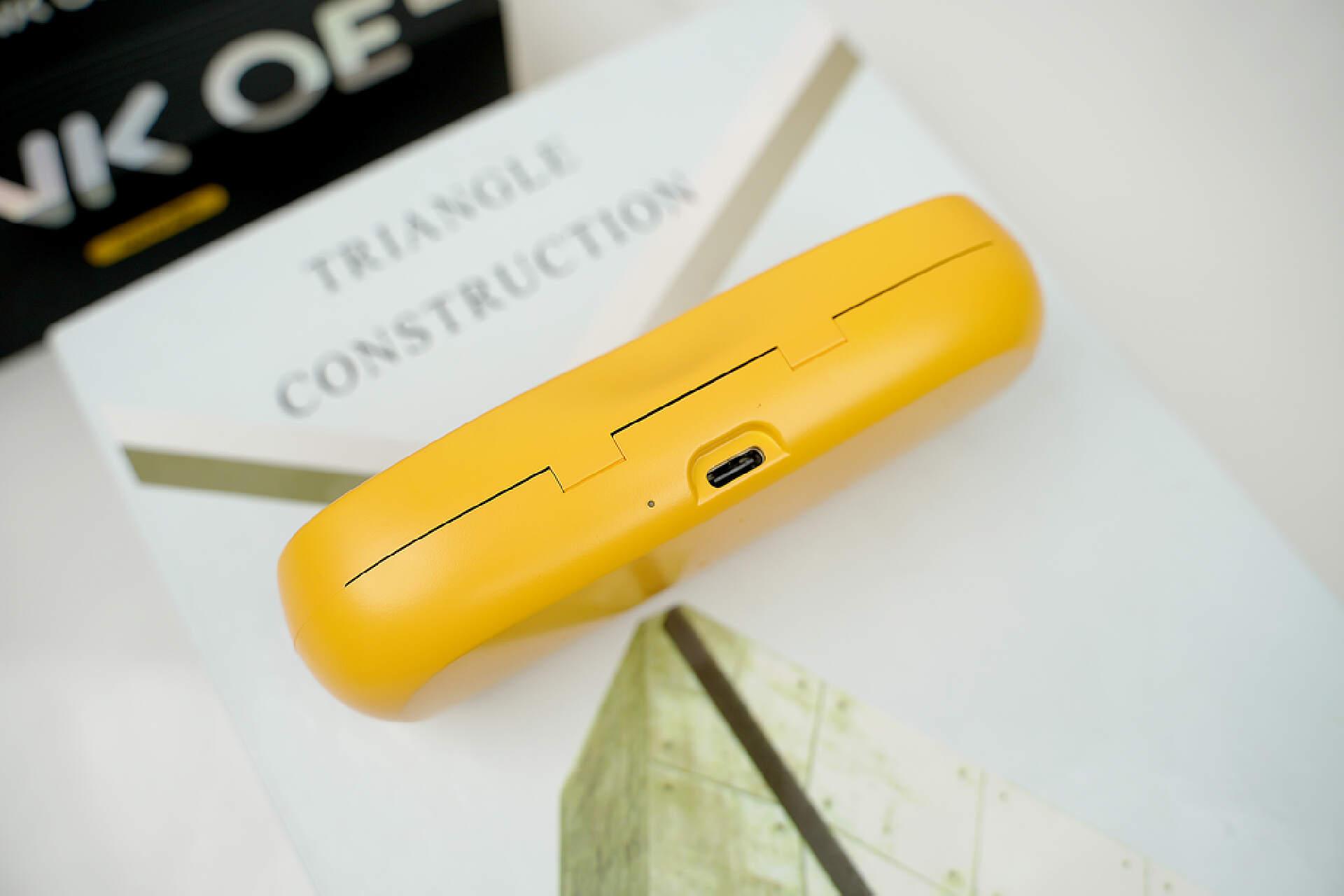 南卡OE Pro有琥珀黄、菱花白、璎珞粉三个颜色,我入手了看上去就充满活力的琥珀黄配色。包装内除了充电盒,还包含了产品说明书和Type-C充电线,其中充电盒表面采用了磨砂工艺,摸上去手感舒适,也不会沾染指纹;127.3*31.9*47.7mm的尺寸无论是随身携带,还是放置在包包里都不会占据太多空间。