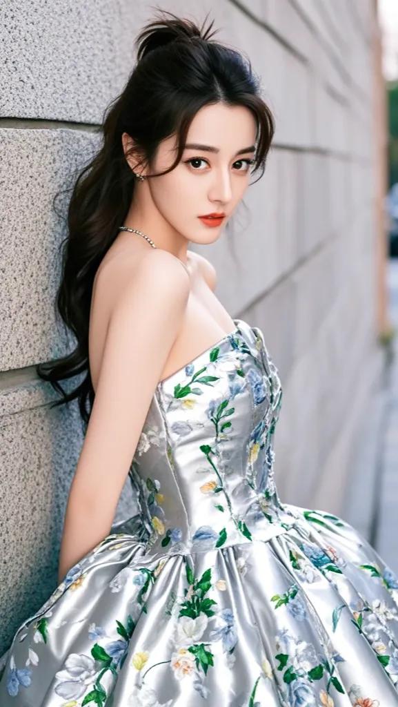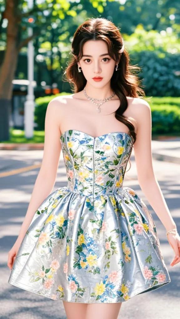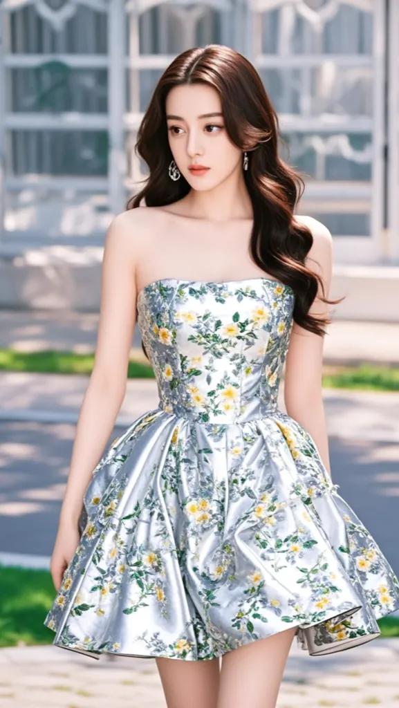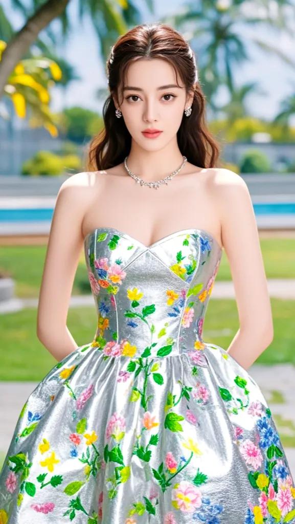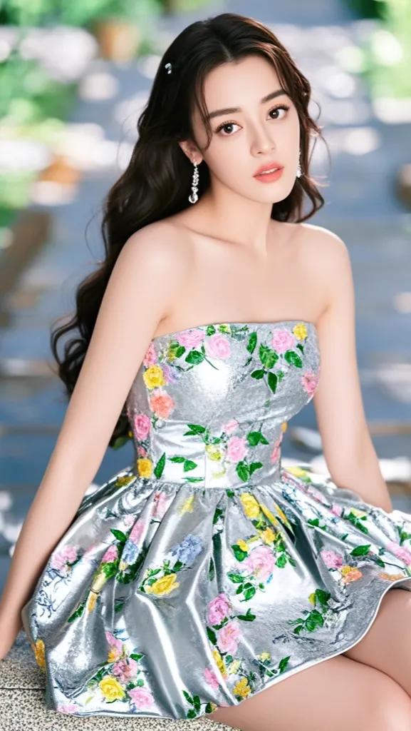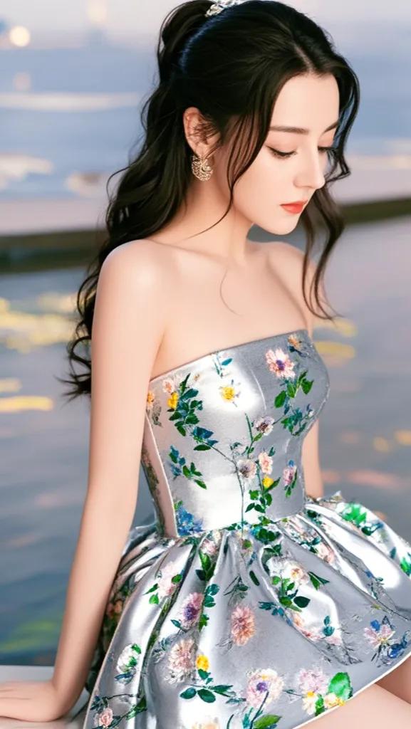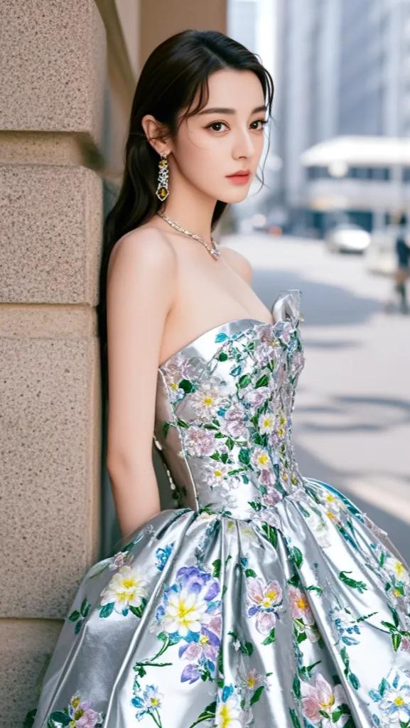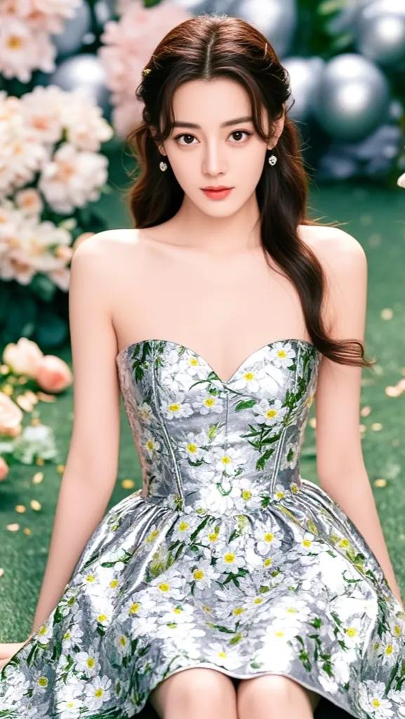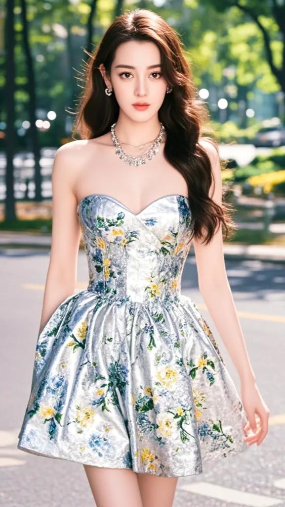 迪丽热巴,银色花卉印花抹胸连衣裙
