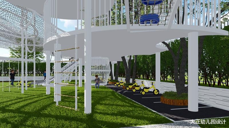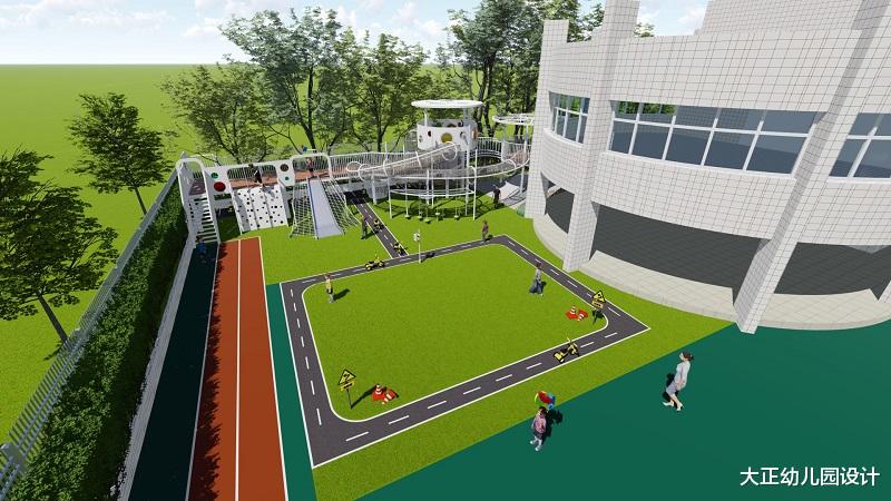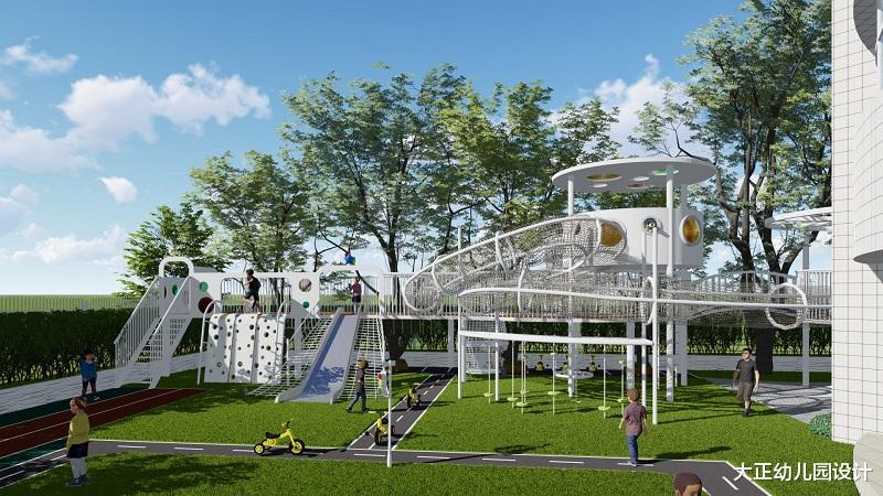 当孩子们进入幼儿园,在操场上玩耍,就会看见一座矗立在建筑右侧的如同宇宙飞船一般的巨大白色堡垒,这个巨大的堡垒是一个可以玩耍和探索的大型无动力玩具,为孩子们广泛的游戏兴趣提供可能性。