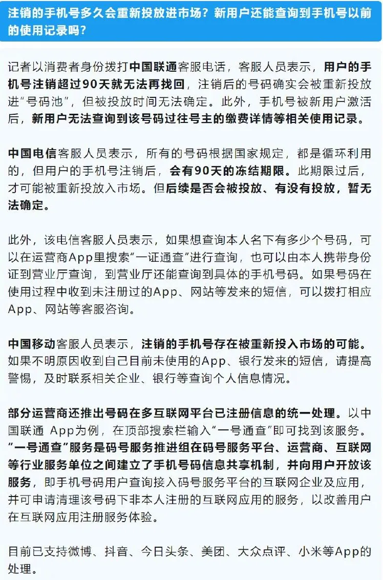 现在手机应用越来越广泛,生活工作出行起居各个方面都离不开手机,手机号要注销的话,很多绑定的相关app也需要及时解绑注销。最好是运营商能够开发一个即安全又便捷的联动功能,对于注销了的手机号,能联网通知到这个手机号关联过的各个平台等完成解绑。