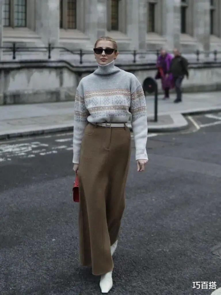 适合2024年冬天学习借鉴的毛衣可以选择“大一点”的款,这里说的大,一是指毛衣版型的长度相较于经典款毛衣来说要更长,以遮住二分之一大腿长度为最佳模板。