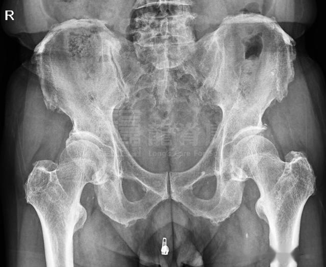 腰椎生理曲度存在,腰椎3-4椎体可见骨桥形成,多棘突偏歪;两侧髂骨略呈左高右低,右宽左窄,骨质增生明显,髂骨边缘可见毛糙影。