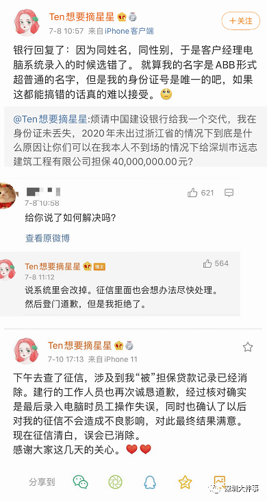 日前,浙江市民陈小姐(微博名“Ten想要摘星星”)喊话远在深圳的建行称,因买房需要个人征信报告,她前往中国人民银行查询征信。结果吓一跳,这名网友名下竟然莫名多了4000万的贷款担保,而且来自深圳。