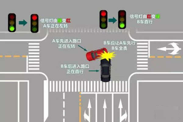 (三)同为左转弯的车辆发生碰撞当没有交通信号灯控制、没有交通警察指挥,且没有交通标志标线控制的路口,两车同时左转弯时,如果发生碰撞,也涉及 “让右原则” 的应用。虽然这里不是严格意义上的交叉直行,但在实际交通规则中,同样存在右侧车辆优先的情况。例如,钟某驾驶货车和邱某驾驶小车在瑞金市沙洲坝镇长征大道 “金庭酒店” 门口路段左转弯时,两车发生刮撞 。在这种情况下,若两车处于相邻左转弯车道,左侧车辆转弯时如果没有充分考虑右侧车辆的行驶情况,导致碰撞事故,左侧车辆通常要负事故责任 。因为在这种场景下,右侧车辆相对处于更有利的视野和通行位置,左侧车辆有责任让右侧车辆优先完成左转弯动作,保障双方安全通过路口。