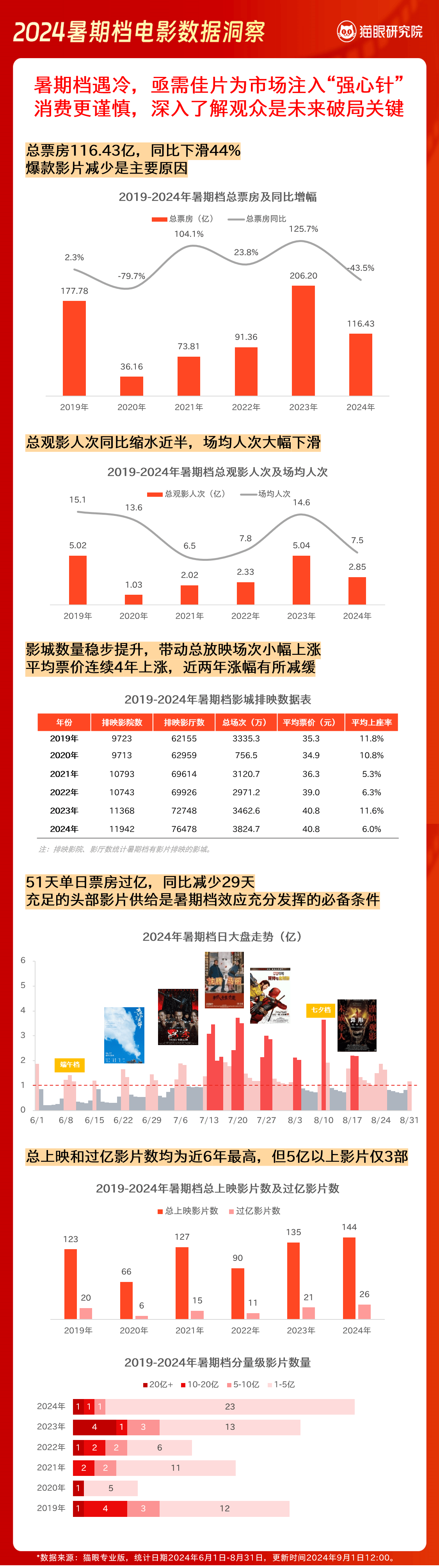 报告显示,2024年暑期档电影票房116.43亿,爆款影片数量减少是导致市场遇冷的主因。变化之中,今年暑期档也有亮点,档期内总上映和过亿影片数量,为近6年最高,多类型国产新片百花齐放。