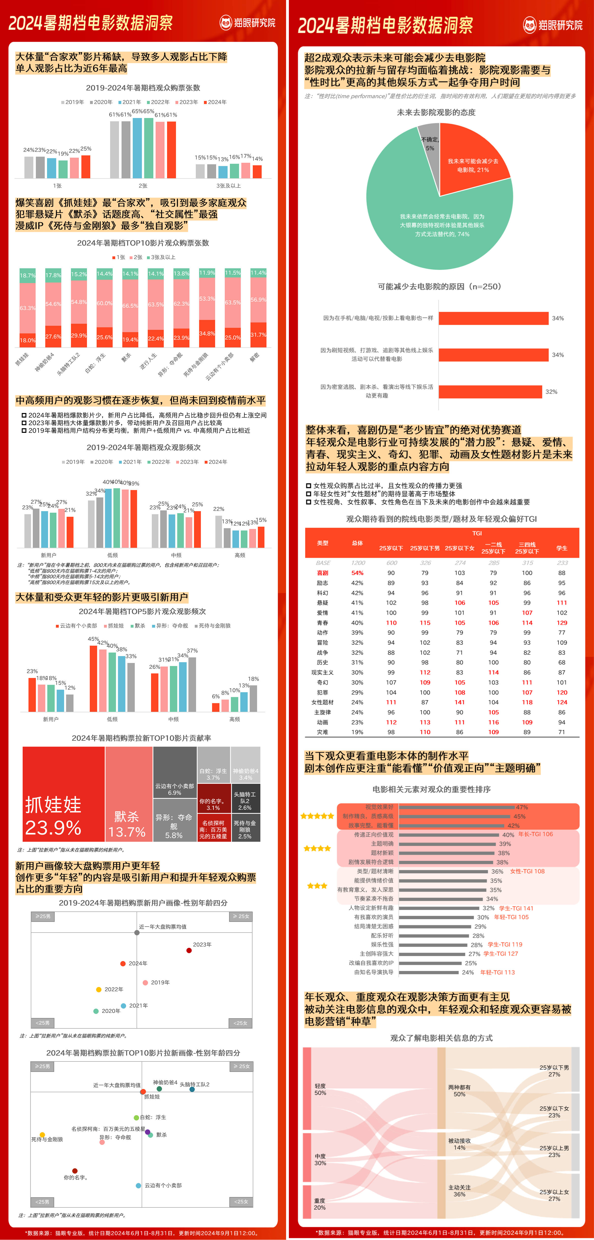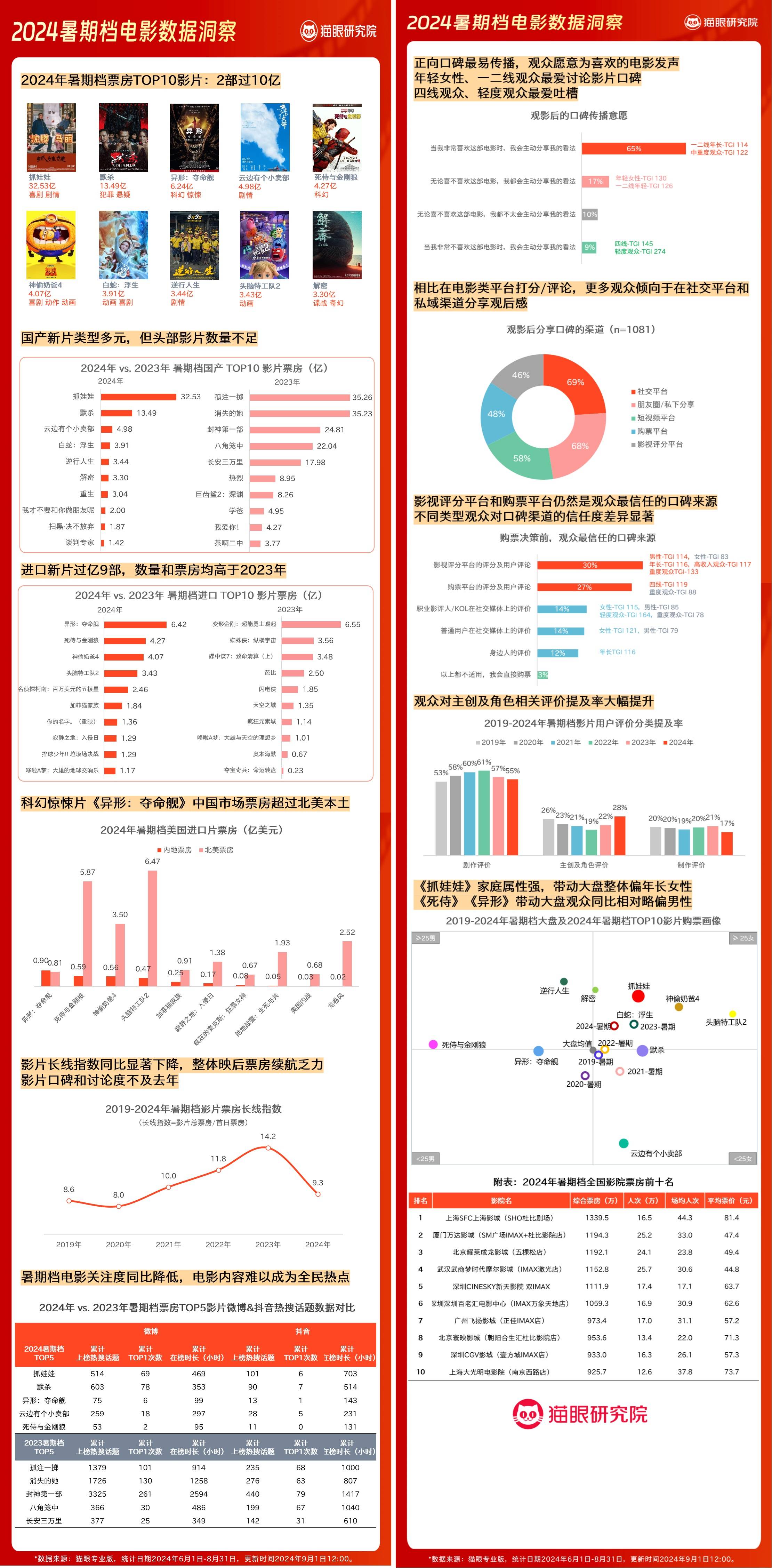 9月1日,猫眼研究院发布《2024暑期档电影数据洞察报告》,(以下简称《报告》),分享多项电影市场洞察,解析市场变化方向。