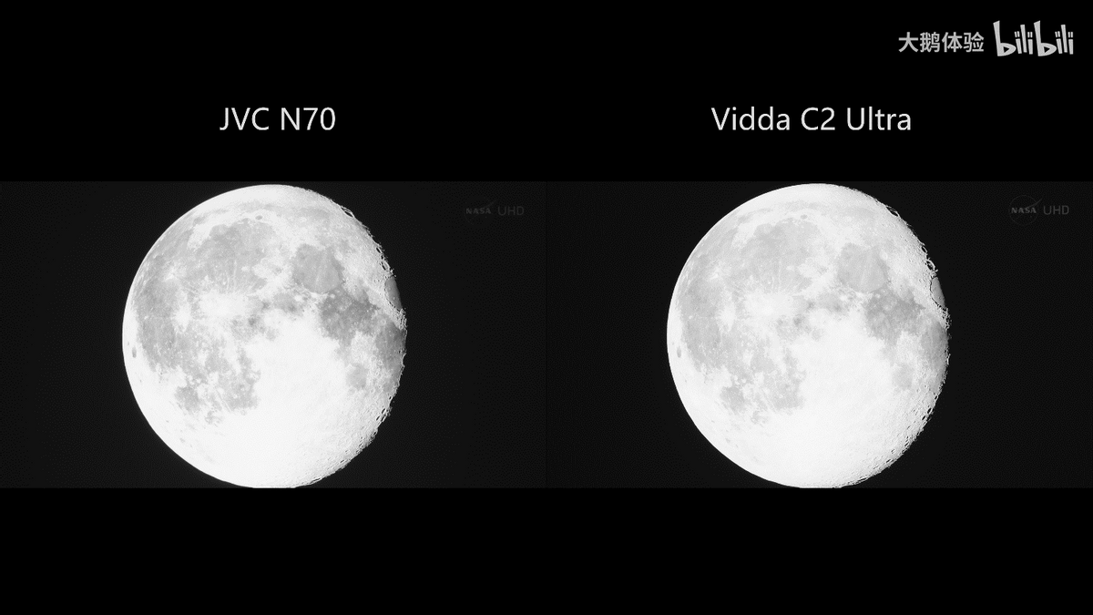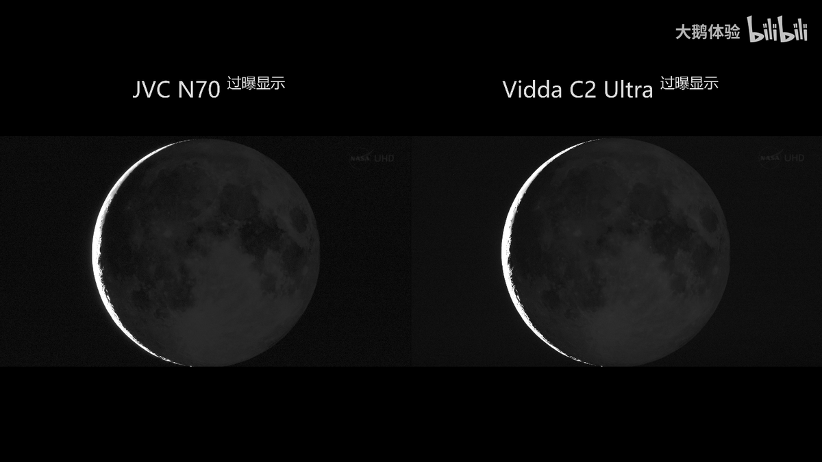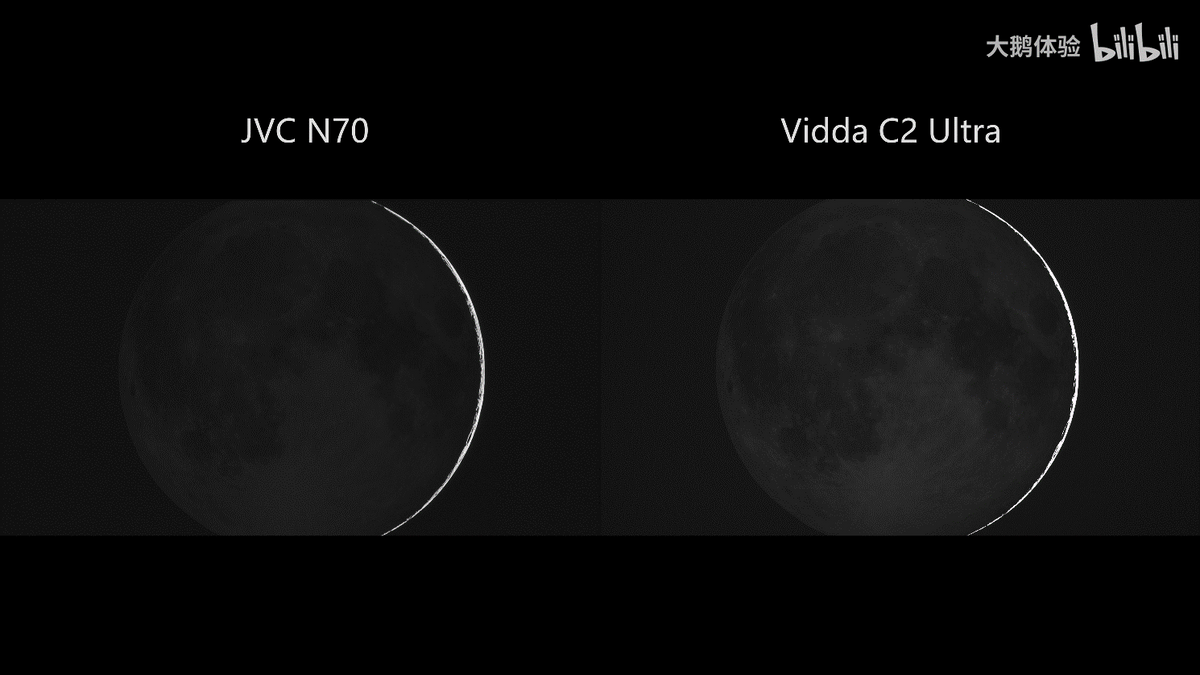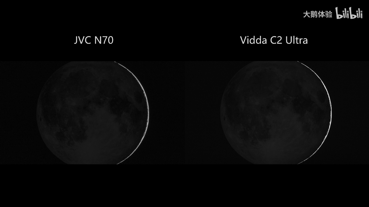 可以看出,JVC的画面暗部细节受到了更大的影响,整体画面的清晰度,是亮度更高的Vidda更好。