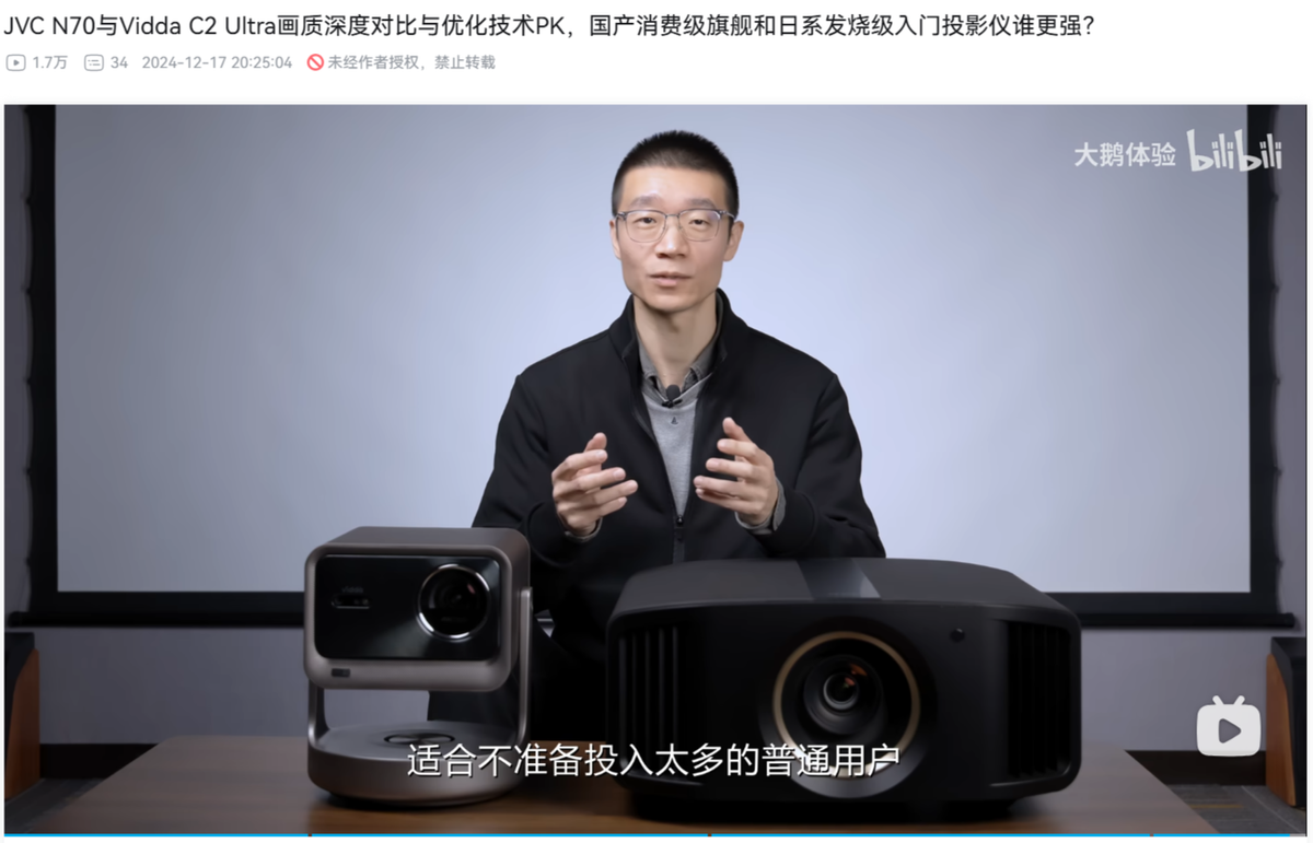 近期,Vidda C2系列三色激光投影更新升级了HDR映射功能,通过智能映射可以更加准确的播放HDR高亮高动态影片,避免了经常困扰影迷朋友们的HDR影片亮度显示不正确现象,可谓是给这台投影增值不少。巧的是,价格是Vidda C2六倍多的JVC N70也有类似的HDR逐帧亮度映射功能。那么这两台价格悬殊的投影,到底谁的HDR映射更出色呢?UP主“大鹅体验”专门对这两台产品进行了详细评测。