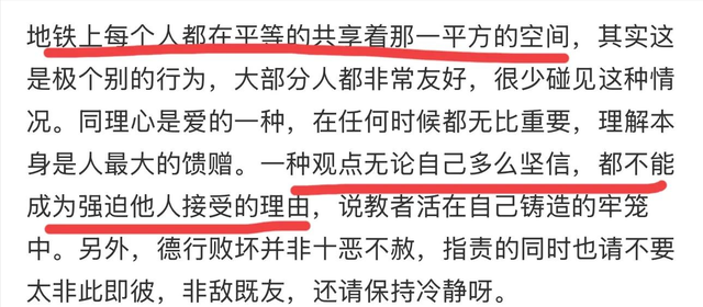 同时,她还认为地铁上属于公共空间,每个人都有权利去平等的享受。