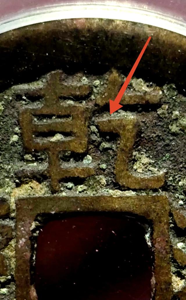 再给大家讲一讲如何区分这种版别,大家可以看正面右侧的通字,对比于普通的乾隆通宝宝源局,这个版的大字版乾隆通宝宝源局,通字有一个斜向下的走势,普通版通字的走之底是平的,具体大家可以看下面的特征图。
