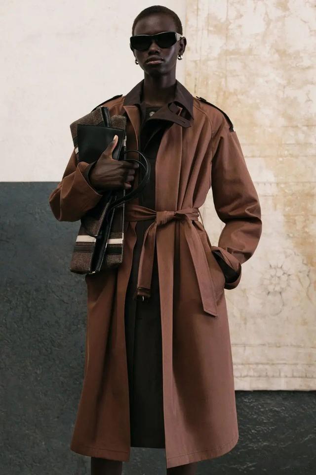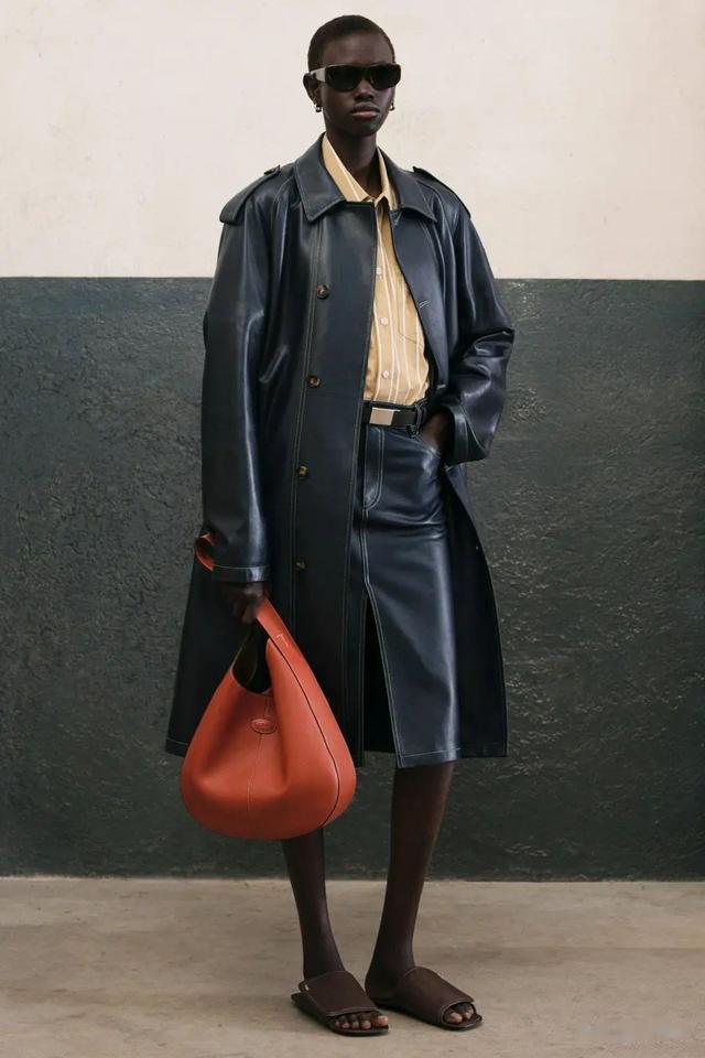 ▲创新设计与经典元素的碰撞在Tamburini的设计中,创新与经典元素的结合尤为显著。其中,一款超长风衣采用了特殊处理的粘合帆布,展现出一丝军装风格,令整个系列更加引人注目。此外,Tamburini还推出了一款二合一的皮革风衣,由两件可拆卸的外罩组成,增添了多样性的穿着选择。这种设计不仅实用,更为时尚界注入了一股新鲜的气息,使穿着者能够根据不同场合和心情进行自由搭配。值得一提的是,Tod's的经典夹克在Tamburini的手中被重新演绎,化身为无袖腰带连衣裙,绒面革衬衫式外套则与加长裤装搭配,展示了他对都市摩登造型的独特理解。这些设计既保留了Tod's一贯的优雅气质,又融入了现代时尚的元素,使品牌在保持传统的同时,展现出新的活力。