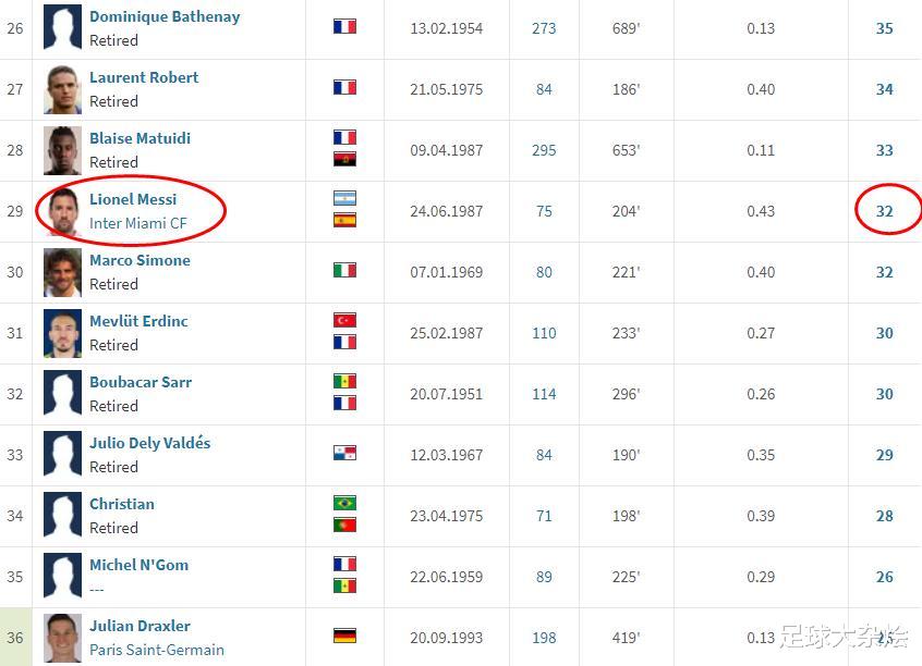 球王梅西在大巴黎效力两个赛季,打入32球,排在第29位。今夏离开大巴黎的梅西,没有得到足够的尊重,许多时候大巴黎的球迷对梅西非常的不礼貌甚至谩骂,希望梅西在大联盟能够享受足球!