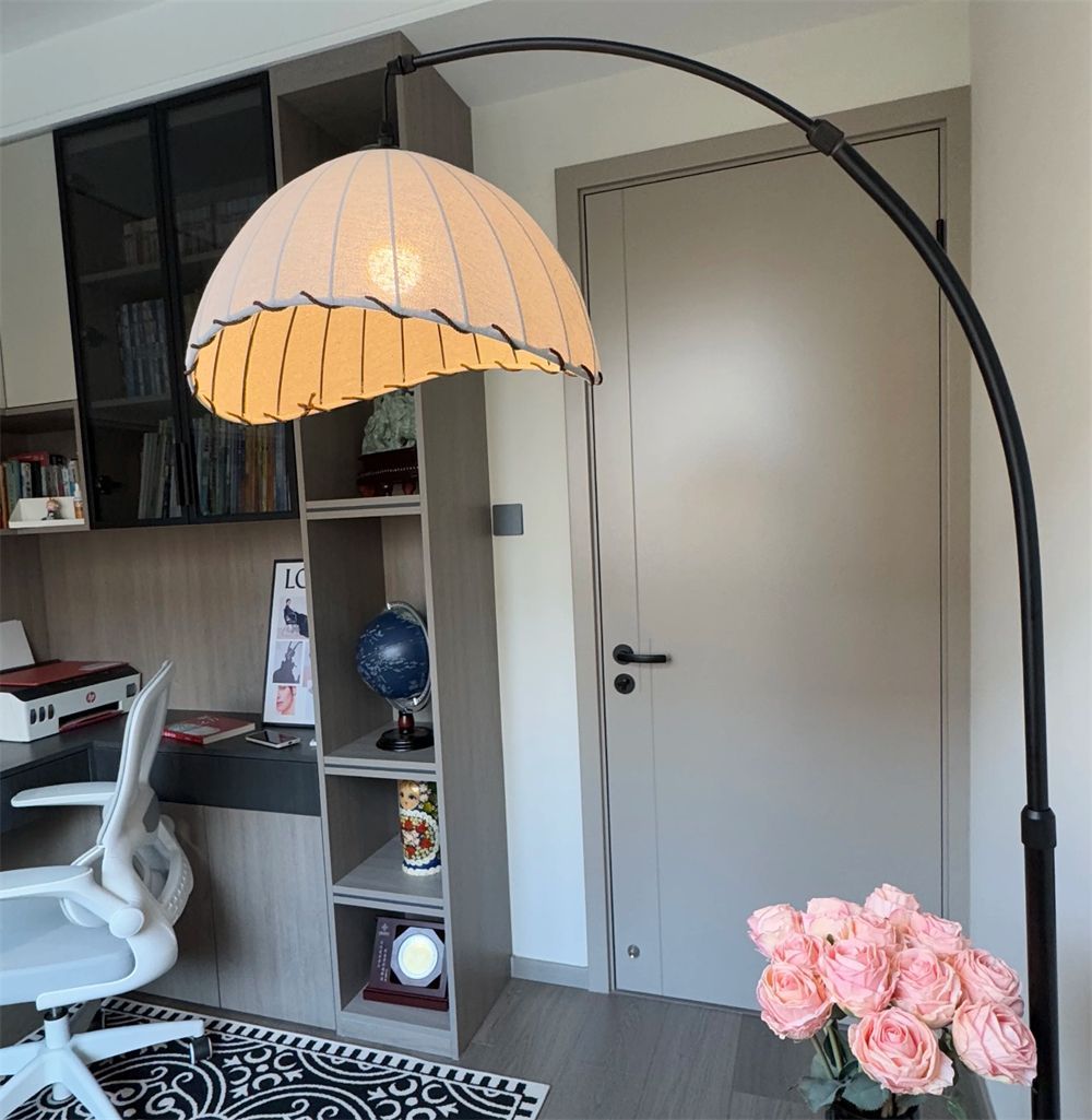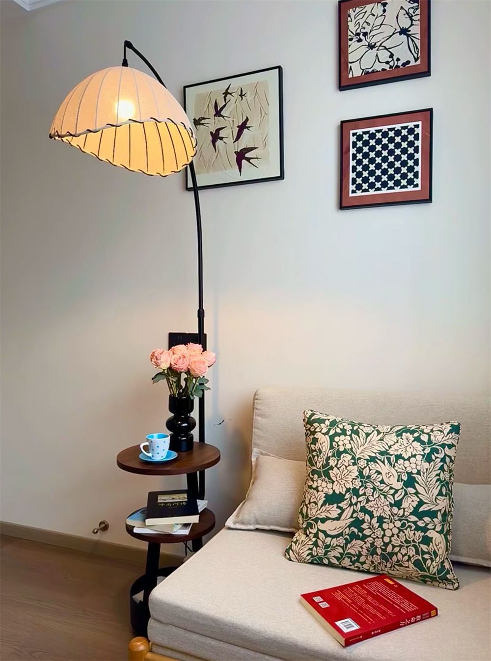 哦对了,这小沙发旁边还有一盏落地灯,一方面,它可以起到阅读时的照明作用,不必每次都打开主灯,另一方面,灯体自带的两层桌台也可以放置手机、水杯或书本等物,十分节省空间。