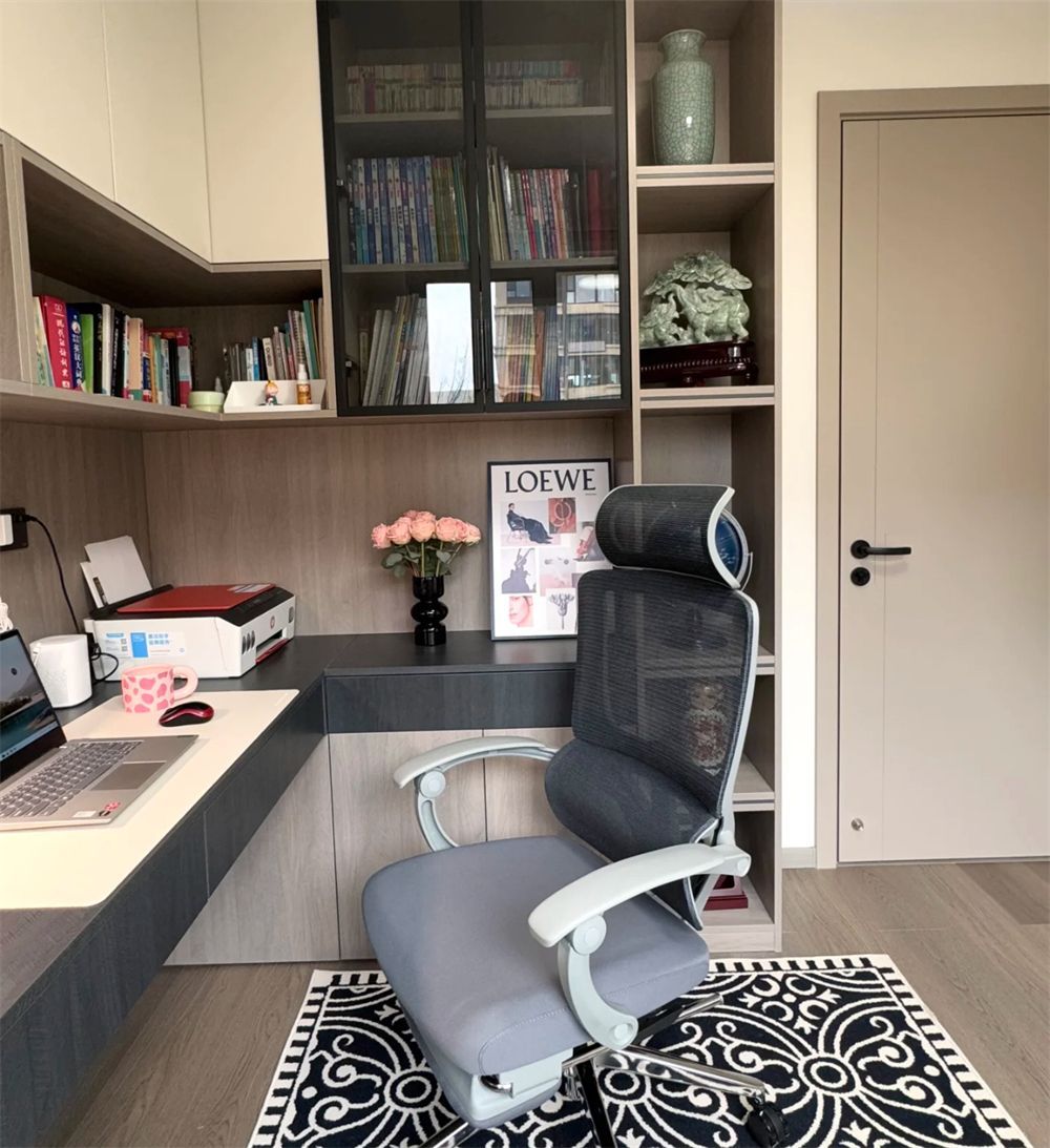 进入书房以后,旁边的柜门其实是向内收缩的状态,避开了门框,不仅显得更加宽敞一些,同时也让进出动线更为流畅,虽说稍微浪费了一点点空间,但个人感觉要比直接做到门边更为合适。
