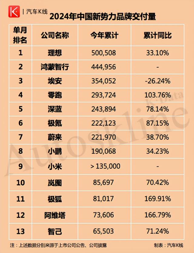 其中,理想汽车2024年累计销量达50.05万辆,同比上涨33.1%;零跑汽车累计销量达29.37万辆,同比增长103.76%;小鹏汽车累计销量为19.01万辆,同比涨幅为34.23%。