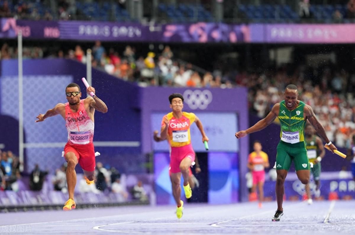 北京时间8月10日凌晨,2024年巴黎奥运会田径比赛继续在法兰西体育场进行,在男子4x100米接力决赛中,由邓智舰、谢震业、严海滨、陈佳鹏组成的中国队跑出38.06秒的赛季最好成绩,排名第7;加拿大队获得金牌,南非队获得银牌,英国队获得铜牌,日本队排名第5,美国队犯规成绩取消。