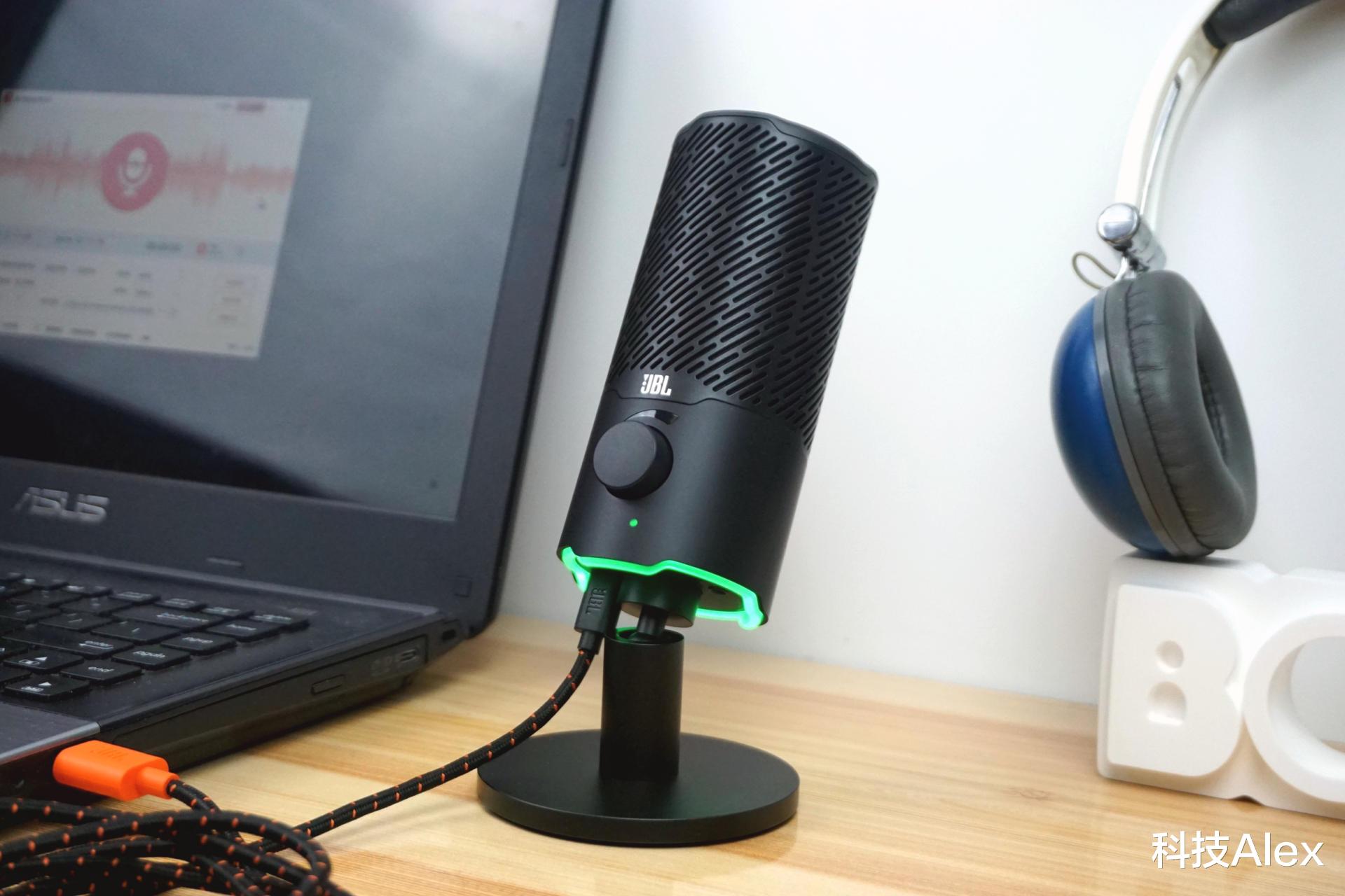 JBL QUANTUM STREAM专业USB电容麦克风底部的RGB灯带可以说是这款产品的点睛之笔。这个灯带有有四种不同的颜色,其中绿色代表正在录音、红色则代表暂停收音;淡蓝色和淡紫色则分别在调节监听音量、收音音量大小时才会点亮,颜色深浅代表音量大小。