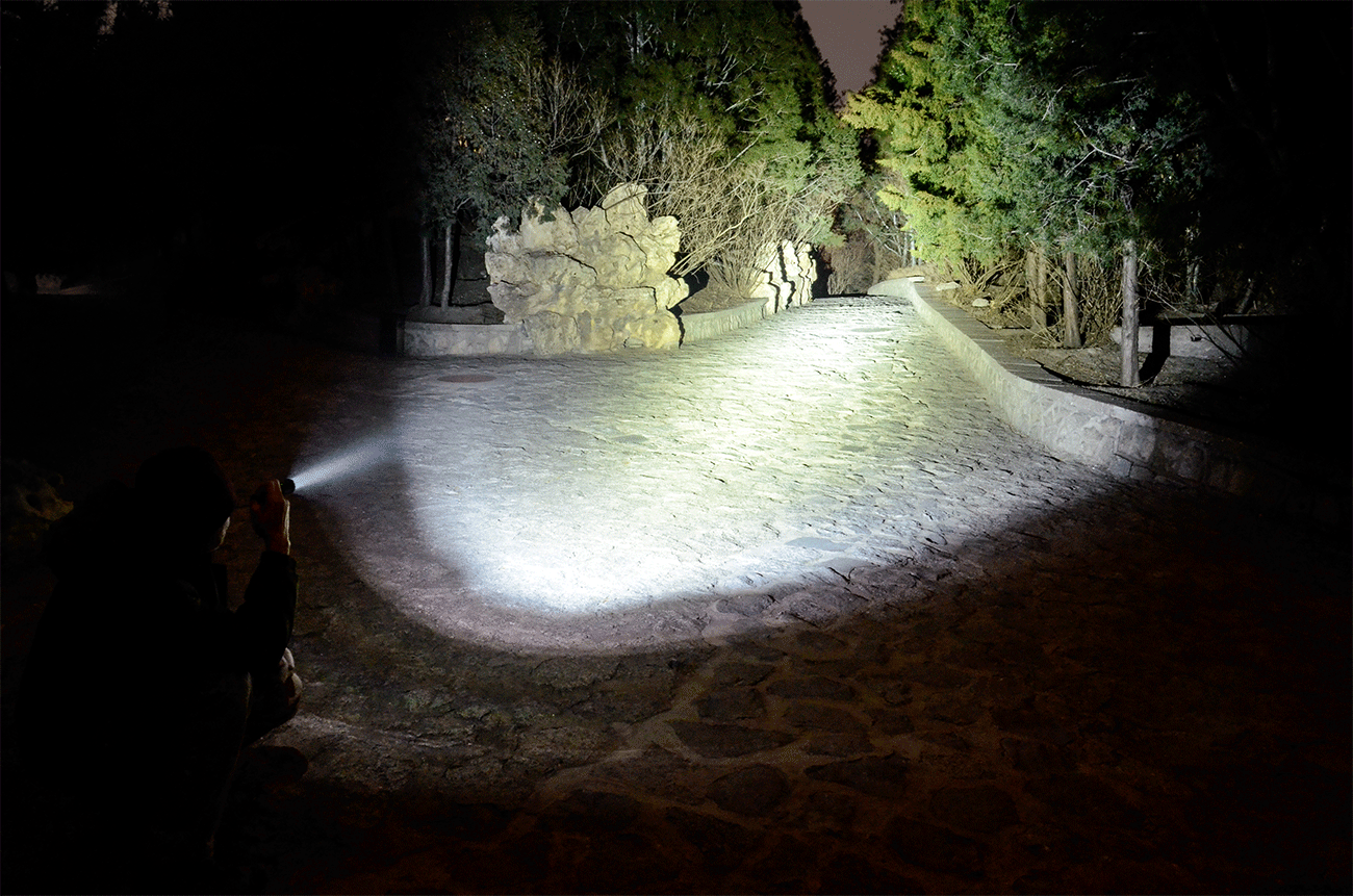 所以XT11GT Pro也有很好的泛光效果,作为铺路使用非常合适,泛光覆盖区域大致为100°向前铺开,照明时候前中后区域的物体层次分明,左右视野比较开阔,与环境有自然的过渡。