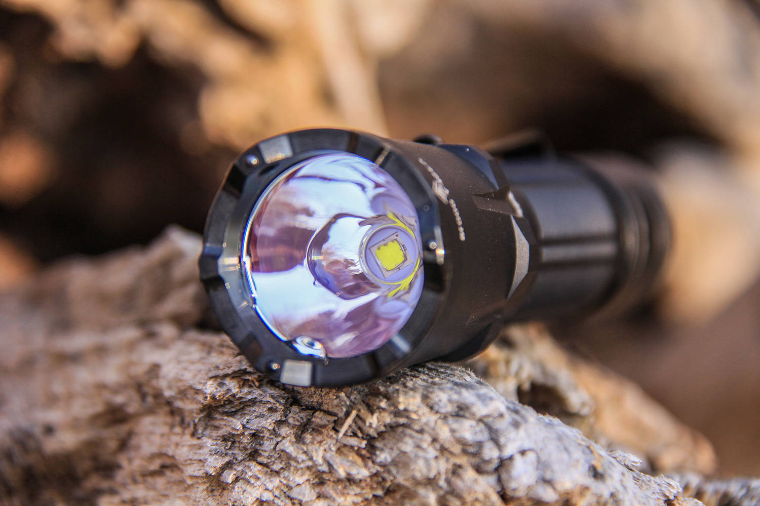 大口径、深灯杯,内部是一枚光面反光杯,这都是聚光手电的特点,灯头光学玻璃镀增透膜,正常看呈现淡蓝紫色,可以提高光线通过率,避免光损失。