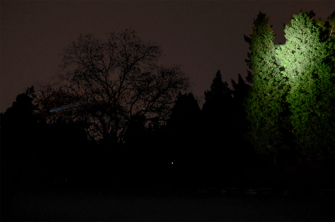 户外照明时,能够看到清晰的光柱表现。主光斑形成的光柱发散角度大约为5°,副光斑形成更大的光锥,开设角度大约为100°左右,带来大面积的照明。
