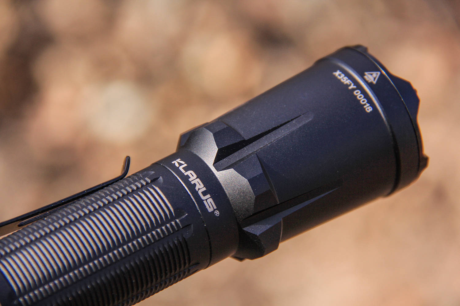 灯颈连至灯头外壁,设计了5条凌厉的刻槽,一方面形成筒身一周的支撑,平放不容易滚动;一方面就是给外观带来效果明显的战术特色;另一方面,形成空气导流槽,有效提高散热效率。