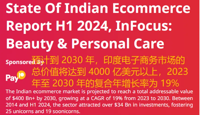 根据研究机构Inc42的发布的《2024年上半年印度电商市场报告》,当前印度电商市场规模约为1160亿美元,而在2023年-2030年间,该市场将以19%的复合年增长率不断扩大,并有望在2030年突破4000亿美元大关。