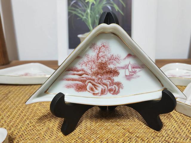 这是一套民国时期,江西景德镇出品,胭脂红山水九子盘。