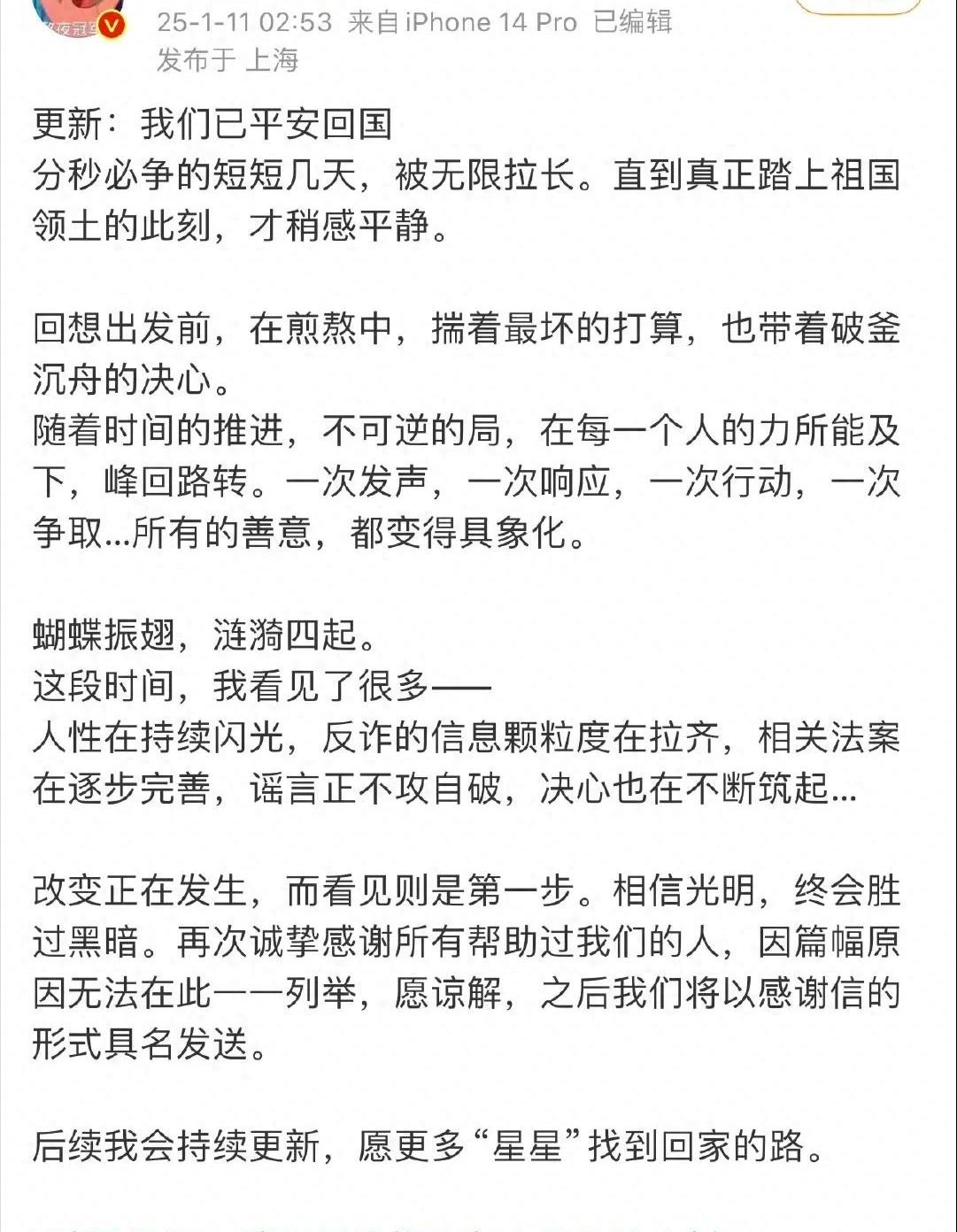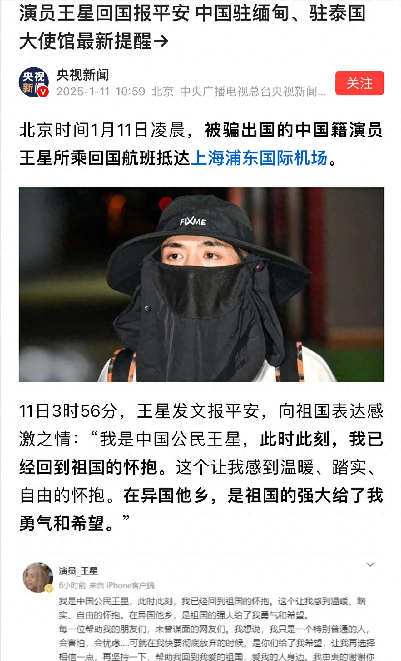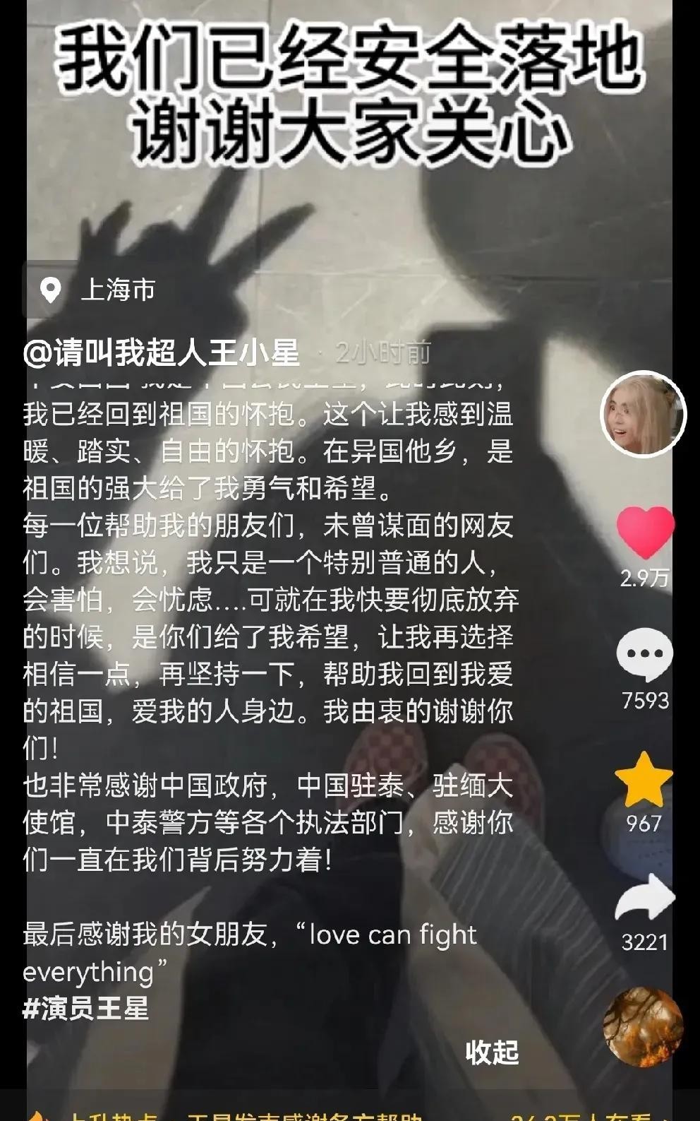 先说说王星回国的事儿。 央视都报道了,凌晨一点多,飞机落地上海。他女友嘉嘉,立马在网上报平安,还晒了张照片,虽然没露脸,但那影子,还有鞋子裤子,一看就知道是他俩。王星自己也发了长文,感谢国家,感谢网友,最感谢的,还是嘉嘉。他说,“爱能战胜一切”,这话,听着真让人鼻子一酸。 你看,真应了那句话,关键时刻,还是得靠爱啊!