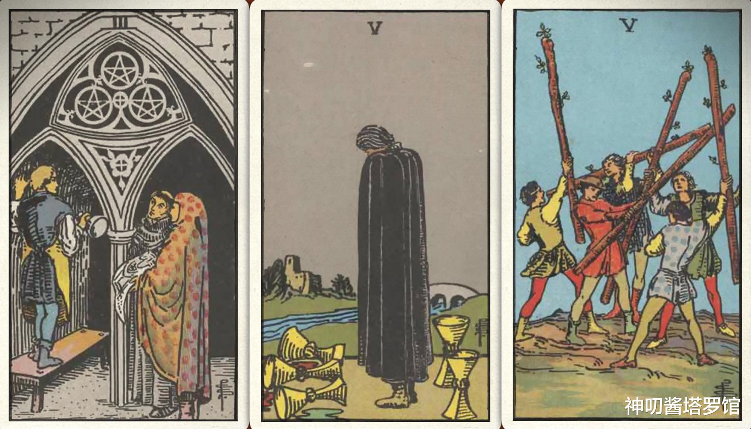 卜牌:星币三+ 圣杯五+ 权杖五+