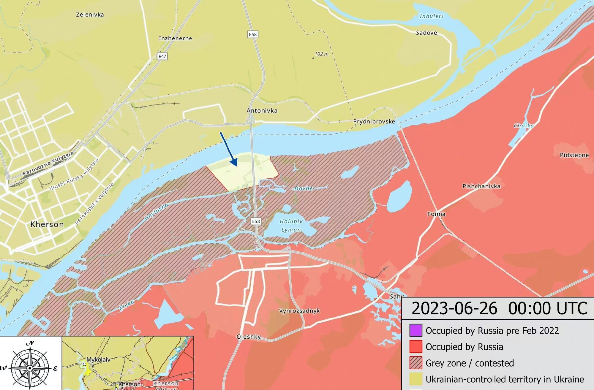 最近一个星期,随着新卡霍夫卡水库区逐渐干涸,下游地区河流宽度下降。乌军在安东诺夫大桥附近非常活跃。