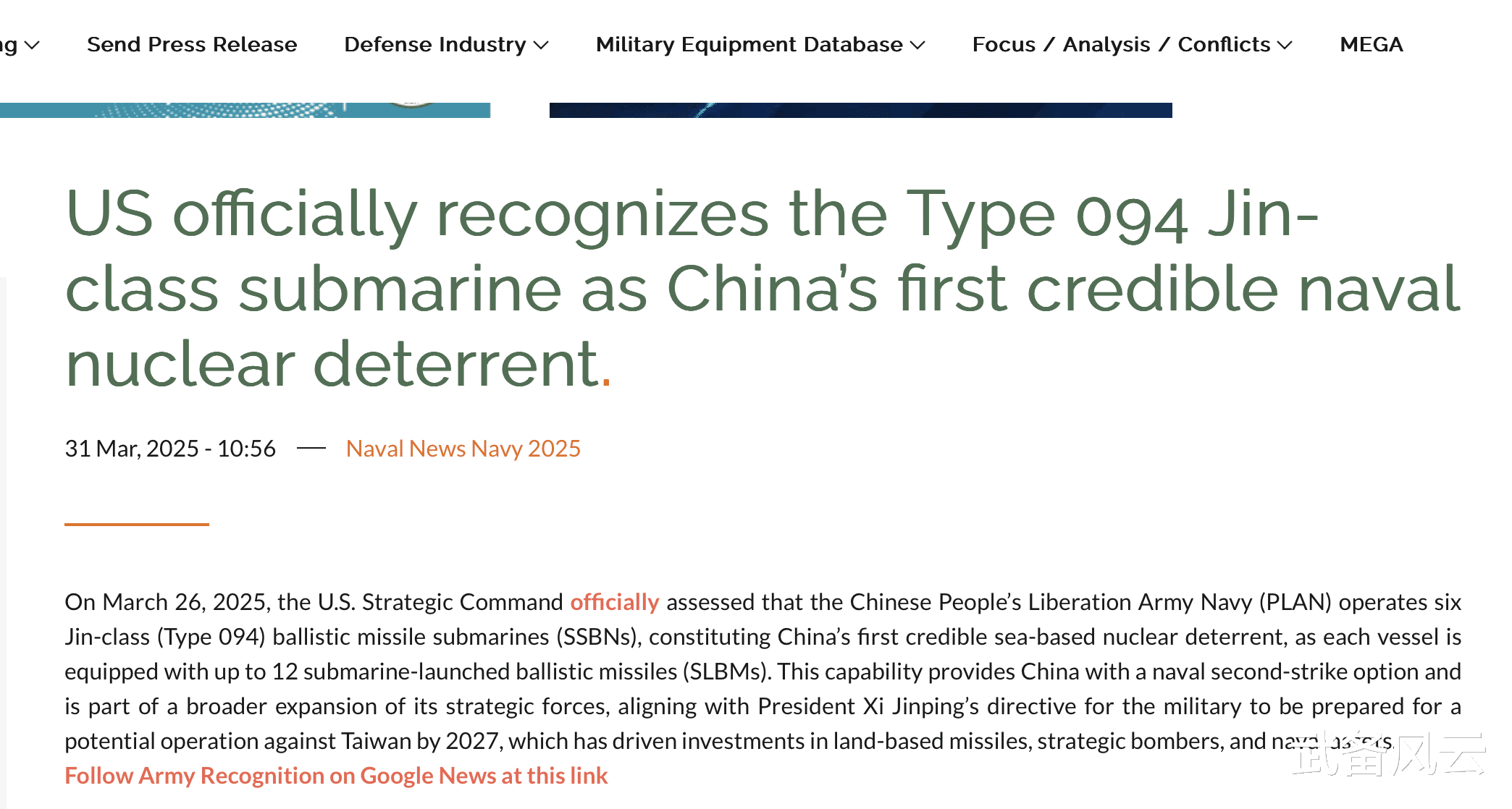 核力量是大国战略平衡的基石,就在不久前,在美军战略司令部出台的一份报告里,美军就正式承认了,094战略核潜艇的威慑力惊人,是中国的第一个具有可靠的二次核反击能力的潜艇,帮助中国构建起了可信的海基核反击体系。